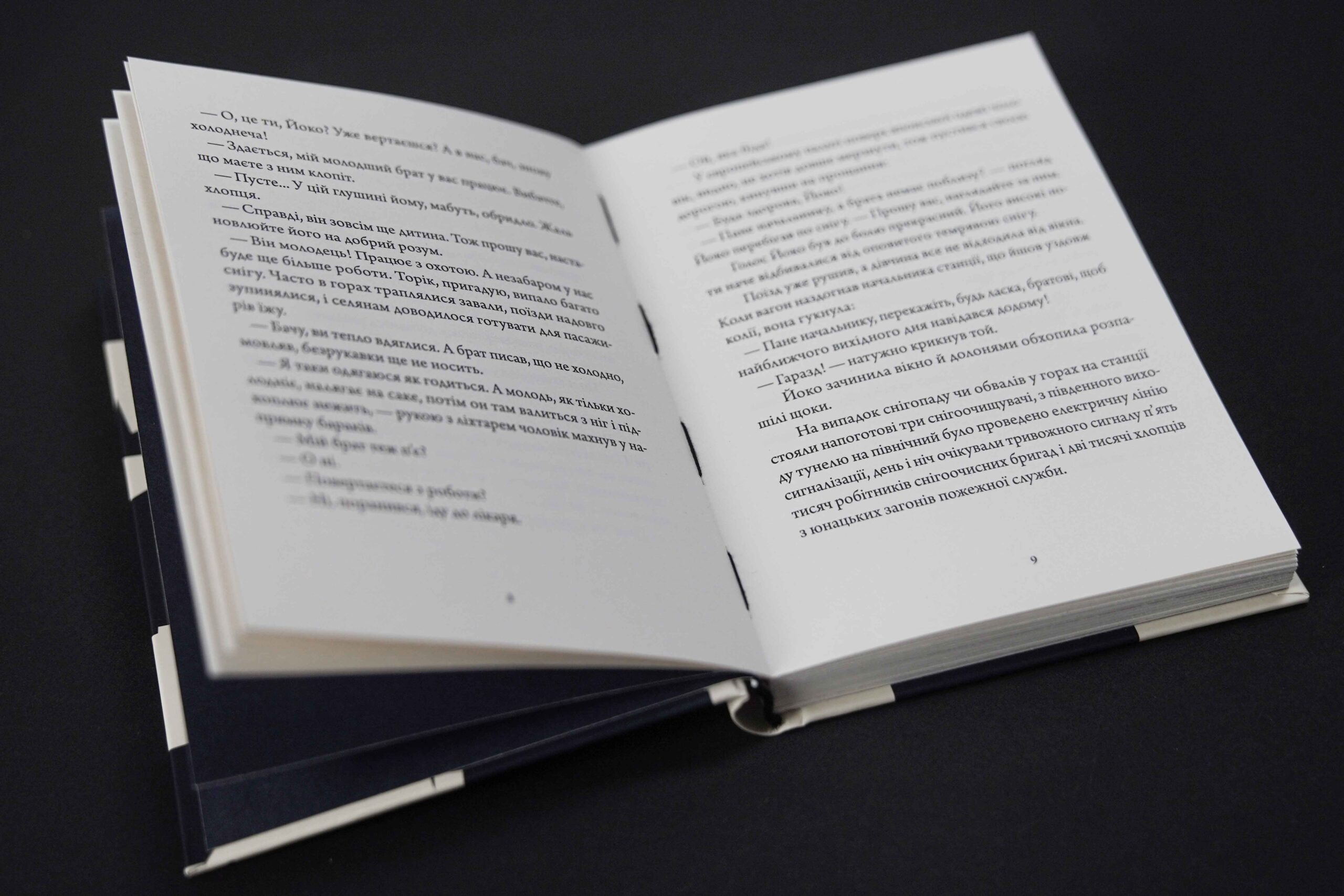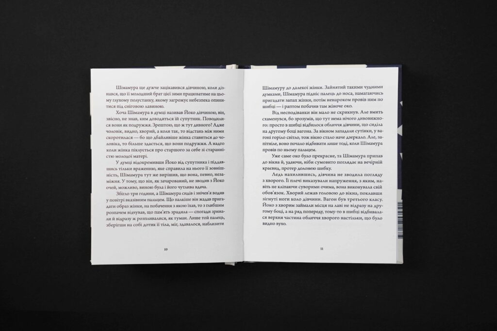 «Країна снігу» — віддалена від буднів і відділена горами місцевість, де можна зійти з каруселі марнот, відпочити душею і тілом. У цій країні навіть сніг падає повільніше, ніж у Токіо. Там самотній столичний естет Шімамура зустрічає ніжну гейшу Комако — неможливе й недосяжне кохання, якого вони так жадають і так уникають. У відкритому фіналі їхніх недомовлених стосунків Ясунарі Кавабата відпустить вашу руку — далі треба зробити кілька кроків самостійно: тільки так можна отримати терапевтичний укол Літератури.