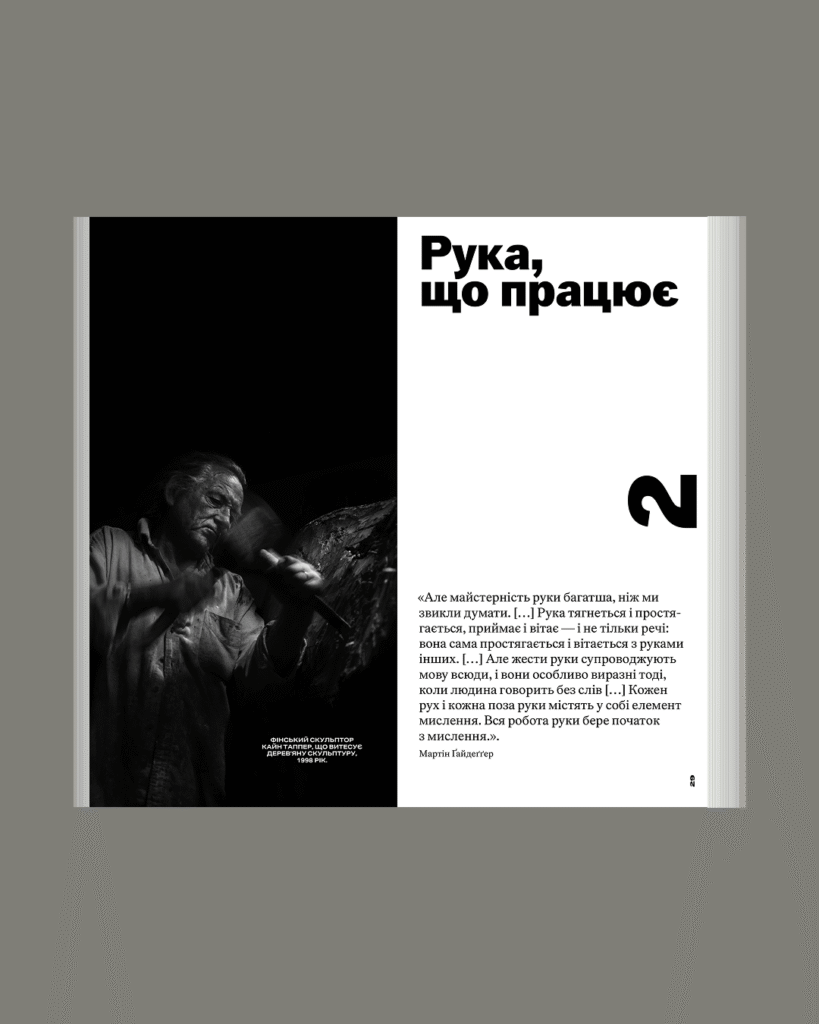 Автор говорить про відірваність сучасних архітекторів від безпоросеренього контакту з ремеслом. Щоб його відновити, потрібно шукати стосунків із ремісниками, майстрами та художниками, стверджує Югані Паласмаа. Це дає змогу з’єднати інтелектуалізований світ архітектора і його мислення з джерелом справжнього знання: реальним світом матеріальності та гравітації, а також чуттєвим, втіленим розумінням цих фізичних явищ.