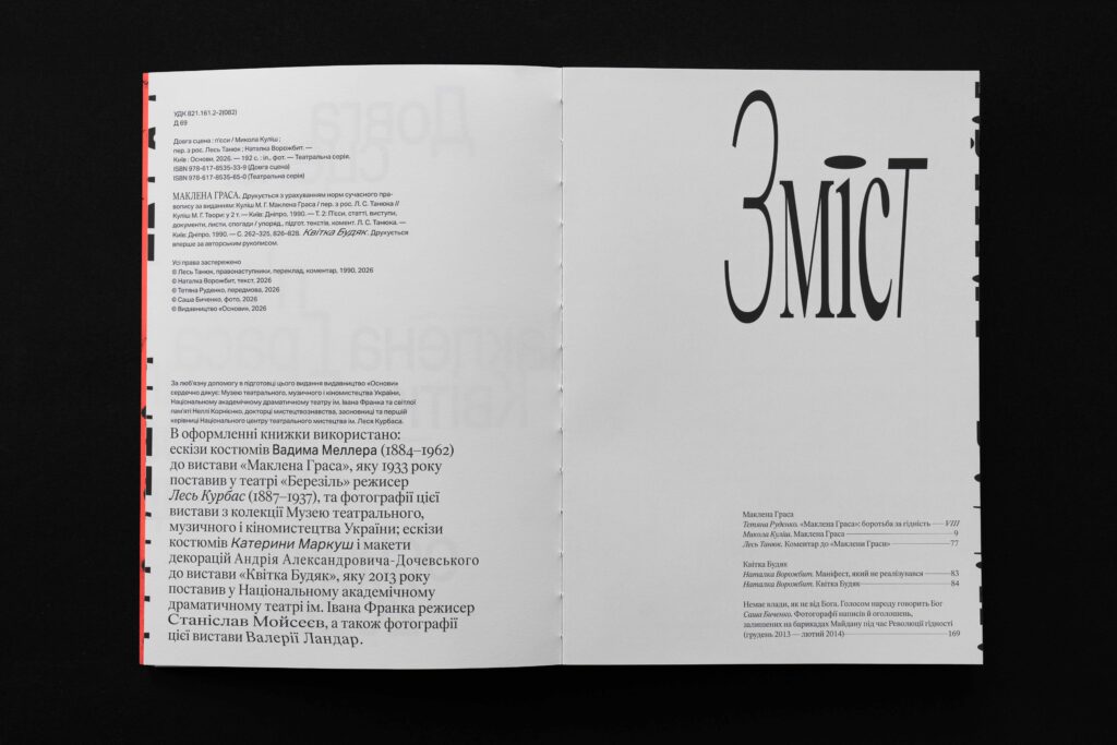 Книга містить історичні фото обох вистав, ескізи костюмів Вадима Меллера до «Маклени Граси», моделі декорацій Андрія Александрова та ескізи костюмів до «Квітки Будяк» Катерини Маркуш.
