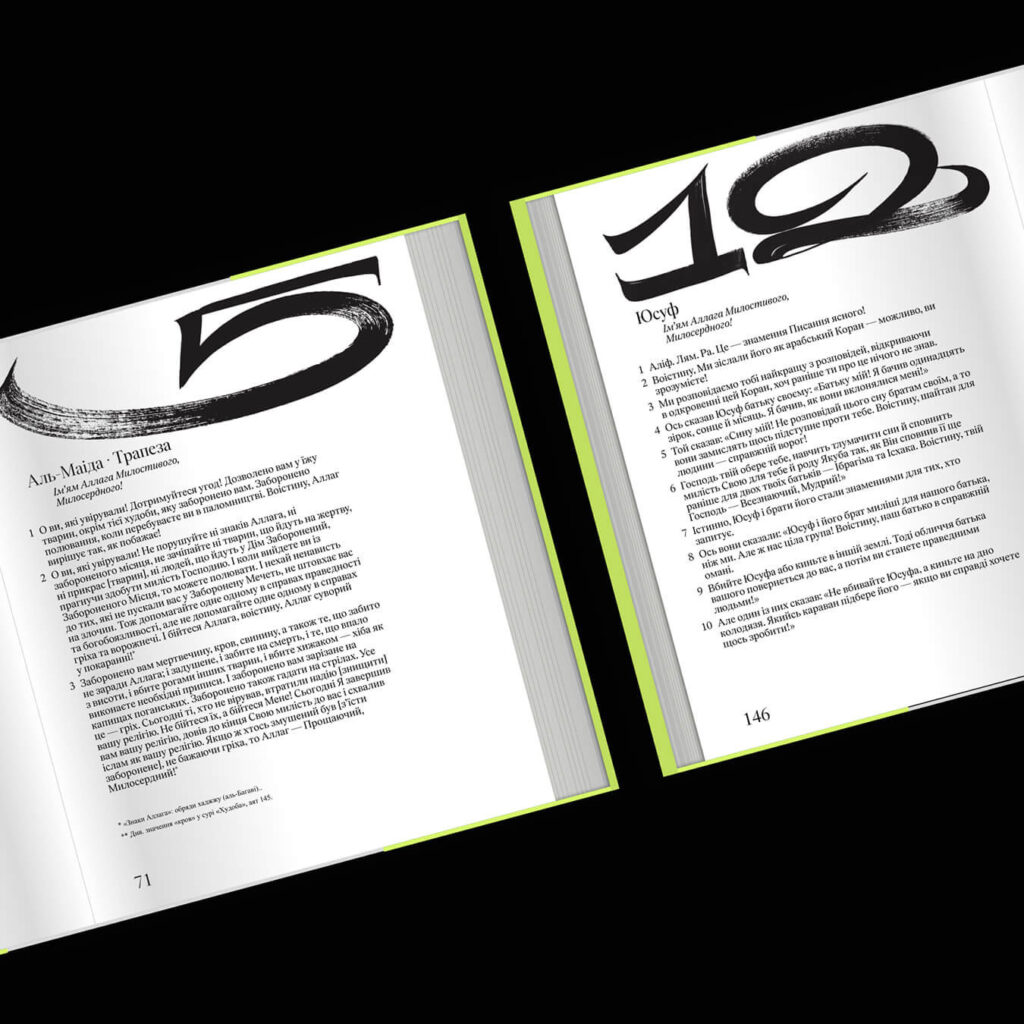 Іслам, як відомо, забороняє зображення людей, тому важливим художнім засобом у мусульманському світі стала каліграфія та орнамент. Для західного ока це, по суті, синонім «орієнтального». Проте нам подумалося, що Коран заслуговує більшого, ніж стереотипна стилізація. Наш Коран насамперед український, а Україна має багату історію взаємодії з частиною ісламського світу і власну каліграфічну традицію, що розквітла свого часу у козацькому скорописі.